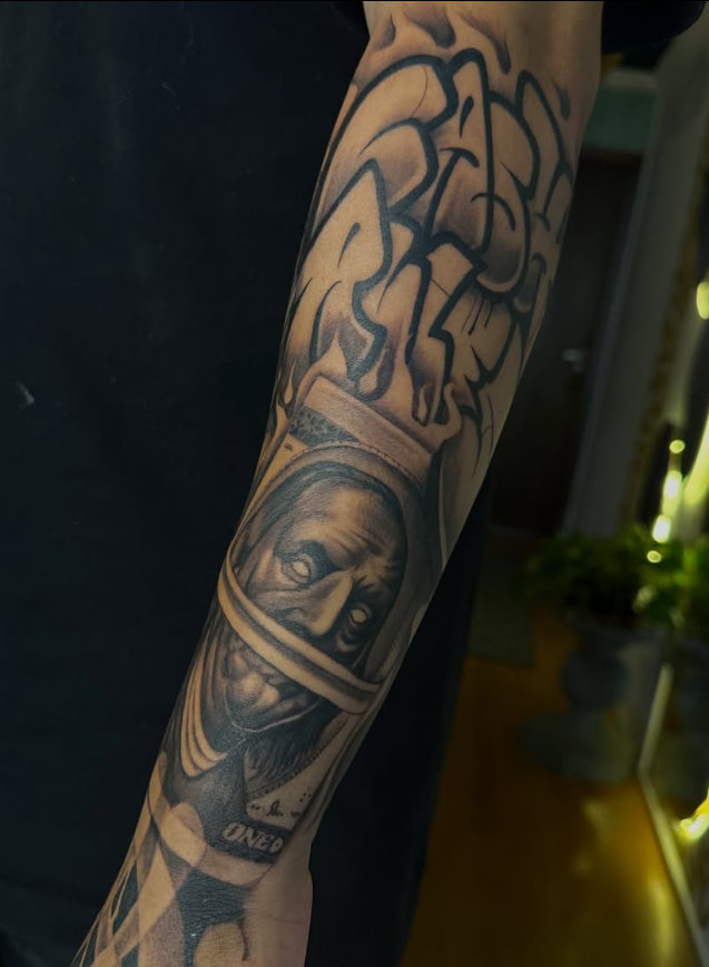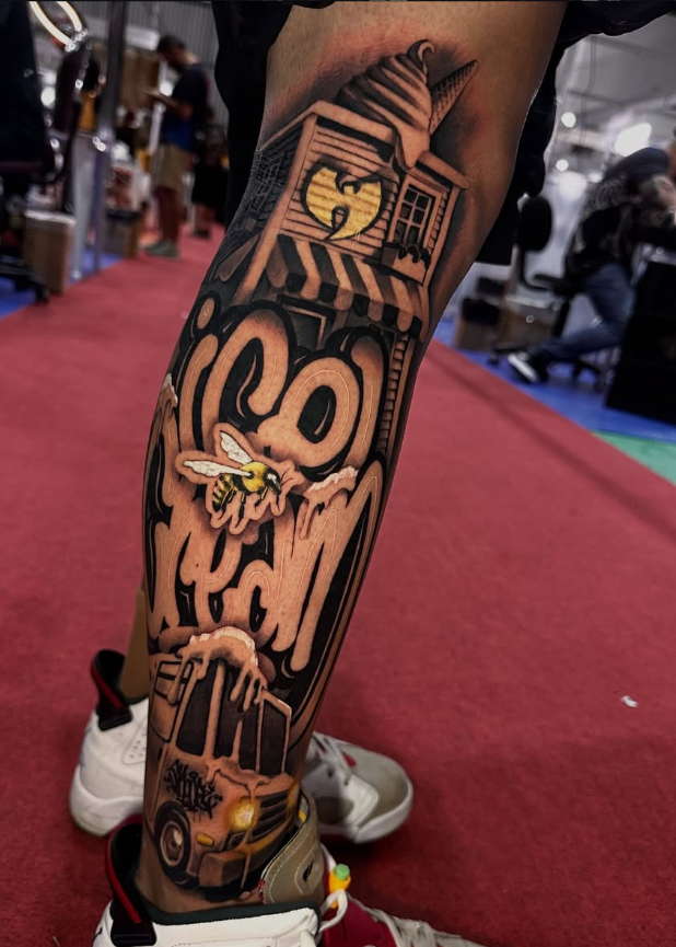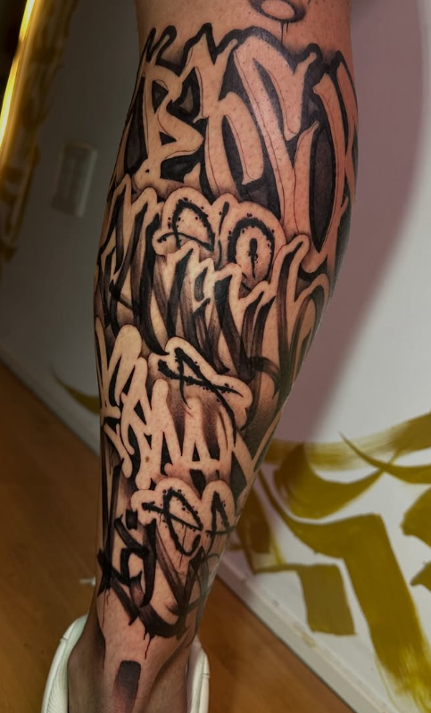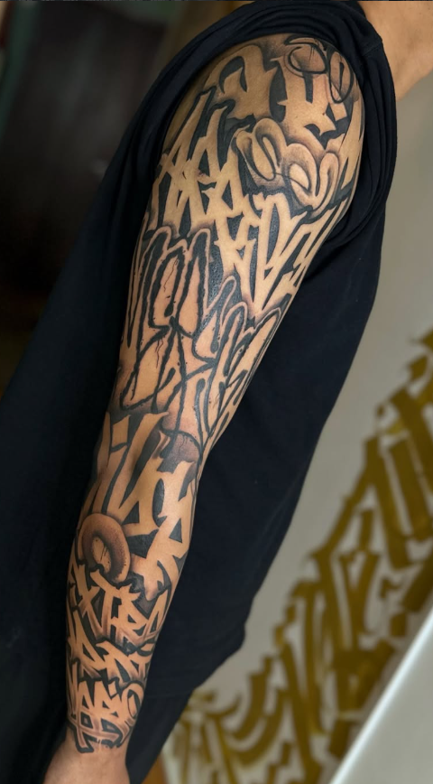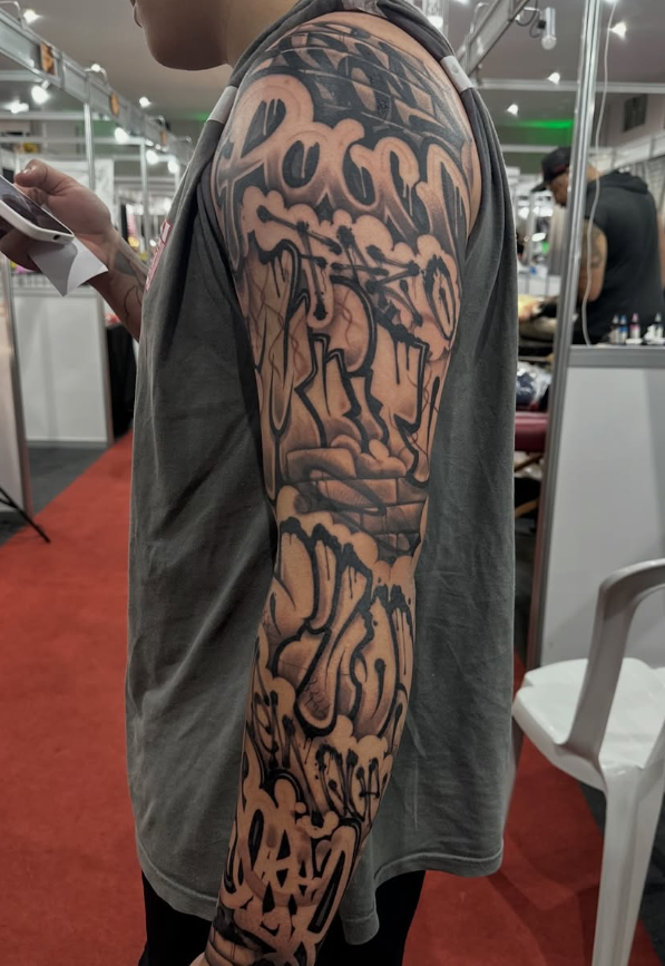 Toda a bagagem e atitude do graffiti traduzidas para a agulha. Essência de rua, impacto visual.
